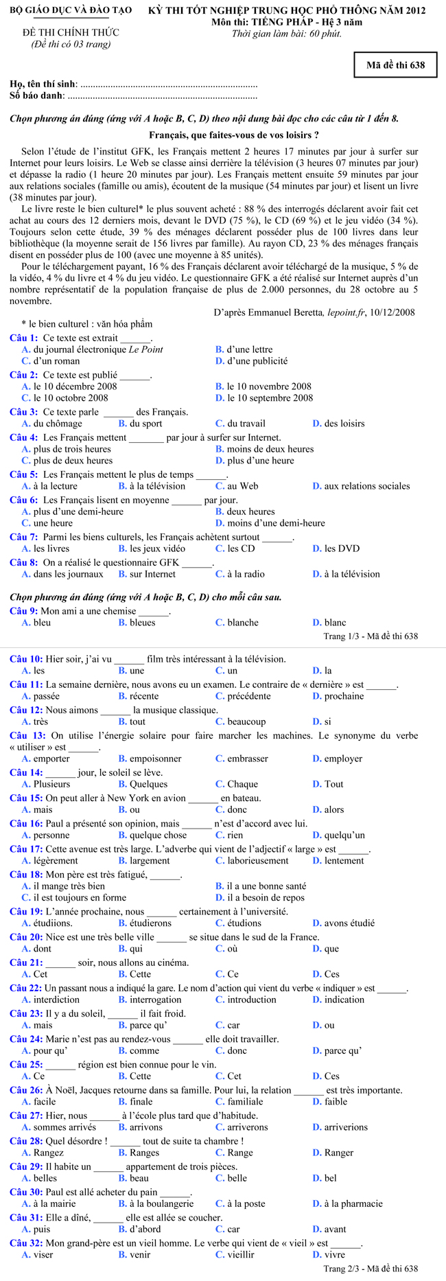 Đề thi tốt nghiệp THPT tiếng Pháp năm 2012 theo hình thức trắc nghiệm dành cho hệ Phổ thông 3 năm - Mã đề thi 638