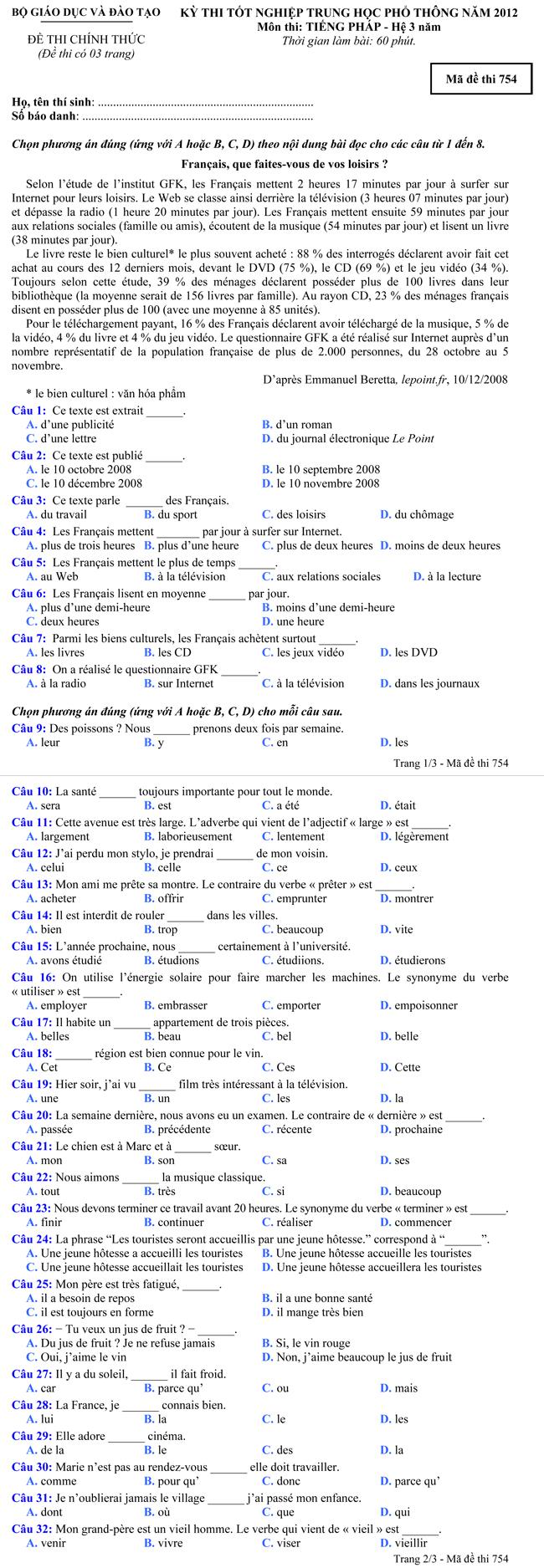 Đề thi tốt nghiệp THPT tiếng Pháp năm 2012 theo hình thức trắc nghiệm dành cho hệ Phổ thông 3 năm - Mã đề thi 754