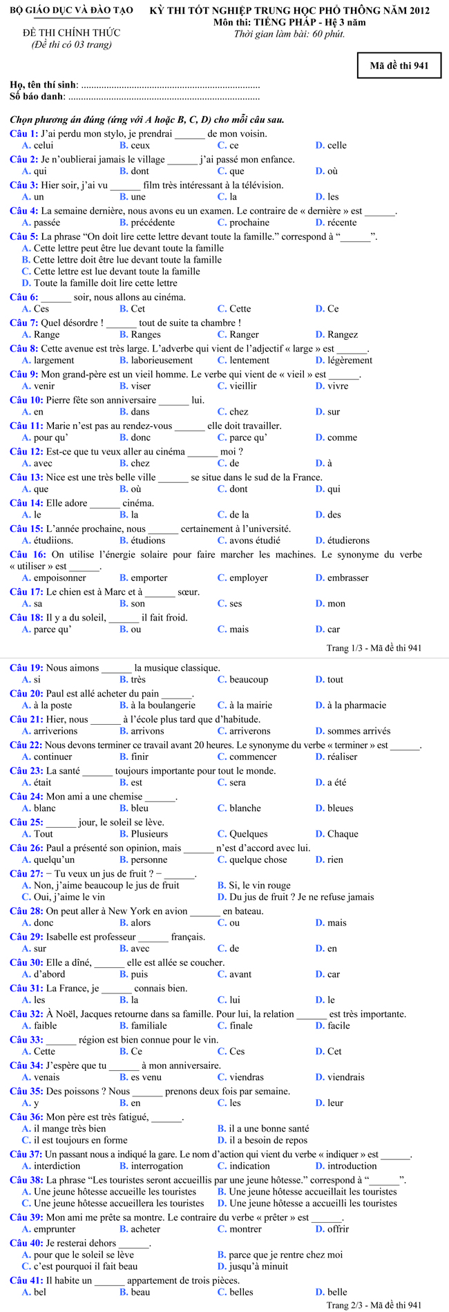 Đề thi tốt nghiệp THPT tiếng Pháp năm 2012 theo hình thức trắc nghiệm dành cho hệ Phổ thông 3 năm - Mã đề thi 941