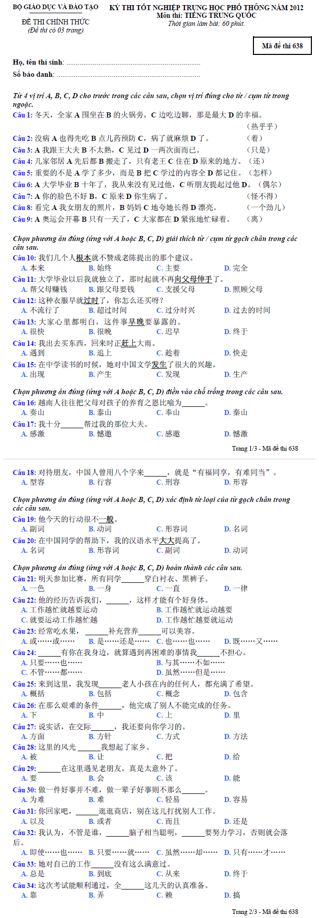 Đề thi tốt nghiệp THPT tiếng Trung hệ Phổ thông năm 2012 - Mã đề 638