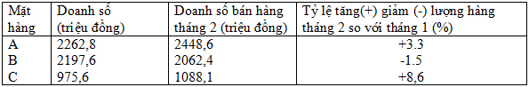 Câu 9: Tài liệu về tình hình tiêu thụ 3 mặt hàng tại công ty X 2 tháng đầu năm 2004 như sau: