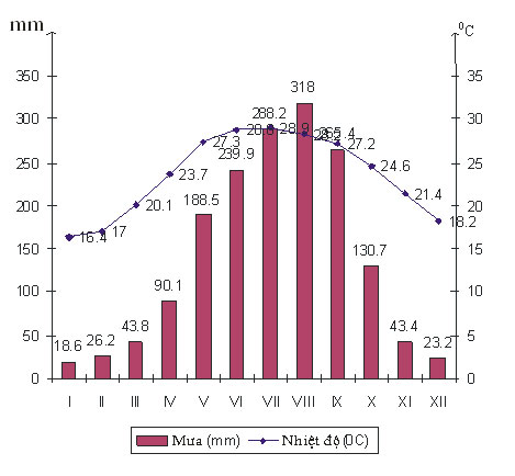 - Nhiệt độ: Nhiệt không đều giữa các tháng, nhiệt độ trung bình năm 23,50C, nhiệt độ tháng cao nhất vào tháng VII 28,90C, nhiệt độ tháng thấp nhất vào tháng I 16,40C, biên độ nhiệt cao 12,50C.