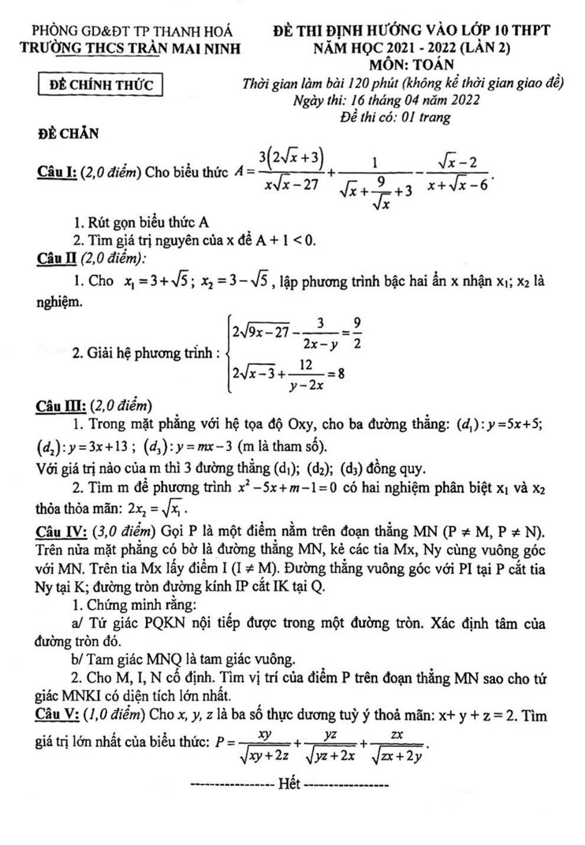 VnDoc.com xin gửi tới bạn đọc bài viết Đề thi tuyển sinh lớp 10 môn Toán lần 2 trường THCS Trần Mai Ninh, Thanh Hóa năm học 2022-2023. Mong rằng qua bài viết này bạn đọc có thêm nhiều tài liệu để ôn tập thật tốt cho kì thi vào lớp 10 sắp tới nhé. Mời các bạn cùng tham khảo chi tiết và tải về bài viết dưới đây nhé.