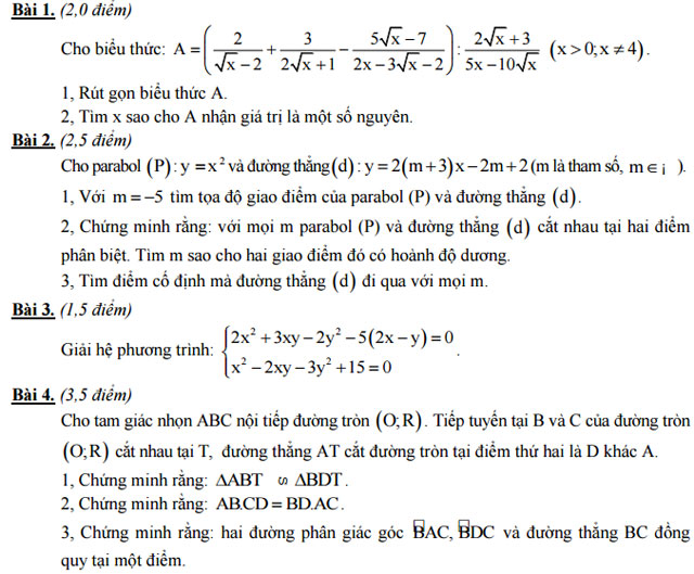 ĐỀ THI TUYỂN SINH LỚP 10 THPT CHUYÊN THÁI BÌNH Năm học 2014-2015 MÔN THI: TOÁN (Dành cho tất cả các thí sinh) Thời gian làm bài: 120 phút (không kể thời gian giao đề) |