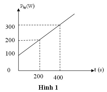 Người ta dự định đun sôi 1 lít nước có nhiệt độ ban đầu 30oC bằng ấm điện hoạt động bình thường có công suất 900W. Công suất hao phí khi đun nước phụ thuộc thời gian theo đồ thị như hình 1. Tính thời gian dự định đun sôi nước? Biết nhiệt dung riêng của nước là 4200J/kg.K.
