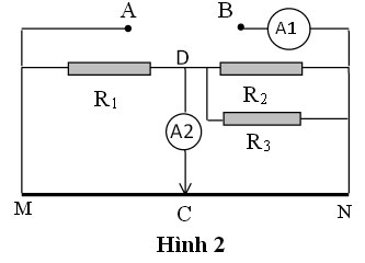 Cho sơ đồ mạch điện như hình 2. Hiệu điện thế giữa hai đầu mạch điện A và B là UAB = 8V luôn không đổi; các điện trở R1=2, R2 =R3 = 6. MN là một đoạn dây dẫn điện hình trụ đồng chất (không có lớp vỏ cách điện) có chiều dài 2m, tiết diện ngang không đổi S = 0,1mm2, điện trở suất = 4.10-7 m. Bỏ qua điện trở của các ampe kế và các dây nối.