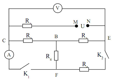 Bài 1. (5,0 điểm) Cho mạch điện như hình vẽ: Biết R₁ = R₂ = R₃ = R₄ = 10Ω, hiệu điện thế giữa hai đầu đoạn mạch UMN = 63V không đổi, vôn kế và ampe kế đều lí tưởng, bỏ qua điện trở các khóa K và dây nối. a) Khóa K₁ và K₁ đều mở. Tìm số chỉ vôn kế. b) Khóa K₁ mở, K₁ đóng, vôn kế chỉ 40,5V. Tính giá trị R₅. c) Khóa K₁ và K₂ đều đóng. Tính điện trở tương đương của mạch điên, số chỉ của vôn kế, ampe kế và công suất tiêu thụ trên đoạn mạch CE. |