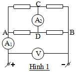Cho mạch điện như hình 1: Ampe kế A2 chỉ 2A, các điện trở có giá trị là: 1, 2, 3, 4 nhưng chưa biết vị trí của chúng trong mạch điện. Xác định vị trí các điện trở đó và số chỉ ampe kế A1. Biết vôn kế V chỉ 10V và số chỉ các ampe kế là số nguyên. Các dụng cụ đo là lý tưởng.