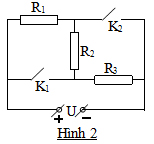 Cho mạch điện như hình 2: Khi mở cả hai khoá K1 và K2, công suất toả nhiệt của mạch là P0. Khi chỉ đóng K1, công suất toả nhiệt là P1, còn khi chỉ đóng K2, công suất toả nhiệt là P2.