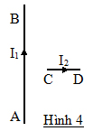 AB là một dây dẫn thẳng dài vô hạn (hình 4). Cạnh dây AB là một đoạn dây dẫn CD. Giả sử rằng đoạn dây CD có thể chuyển động tự do trong mặt phẳng hình vẽ. Khi không có dòng điện, CD vuông góc với AB. Hỏi nếu cho dòng điện qua các dây dẫn và chiều của chúng được chỉ bằng các mũi tên trên hình vẽ thì đoạn dây CD sẽ chuyển động như thế nào?