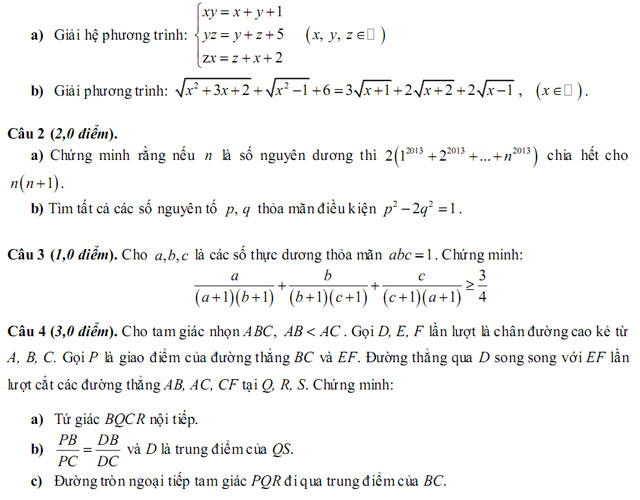 KỲ THI TUYỂN SINH LỚP 10 THPT CHUYÊN NĂM HỌC 2013-2014 ĐỀ THI MÔN: TOÁN Dành cho thí sinh thi vào lớp chuyên Toán Thời gian làm bài 150 phút, không kể thời gian giao đề. ————————— |