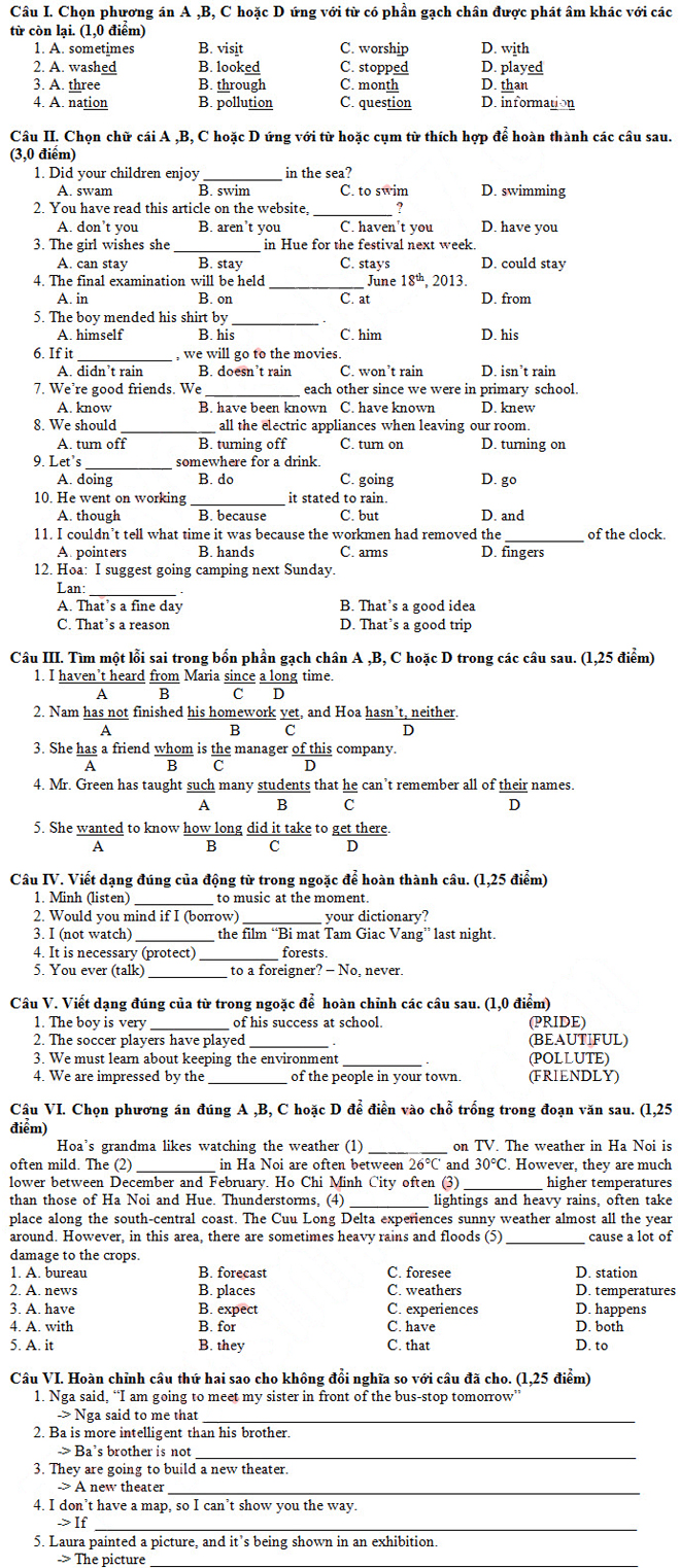 Vndoc.com xin giới thiệu đến các bạn lớp 9, chuẩn bị thi lên lớp 10: Đề thi tuyển sinh lớp 10 THPT tỉnh Phú Thọ năm học 2013 - 2014 môn Tiếng Anh.