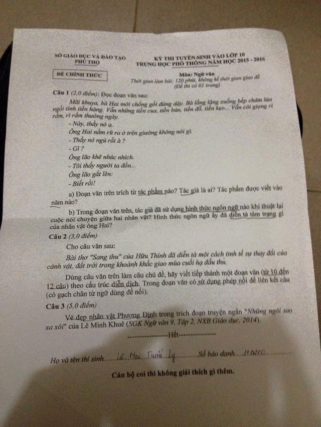Đề thi lớp 10 môn Ngữ văn năm 2016