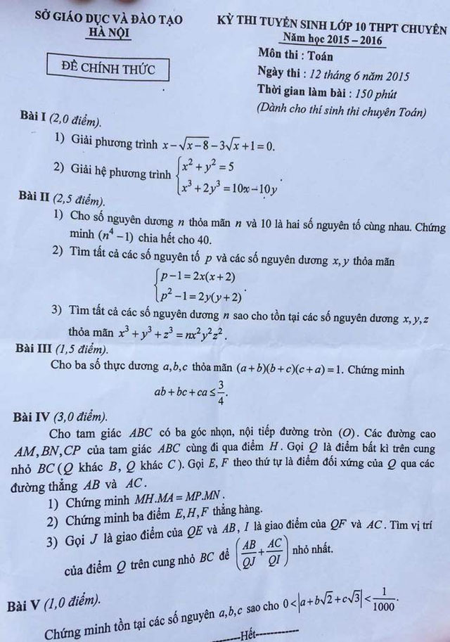 Đề thi tuyển sinh vào lớp 10 môn Toán (chuyên) năm học 2015-2016 Sở GD-ĐT Hà Nội