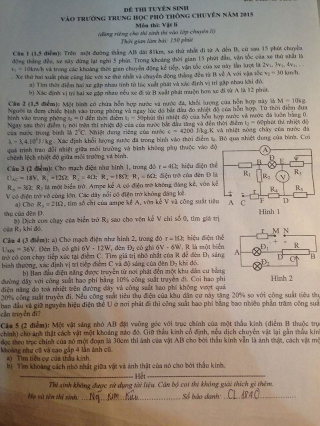 Đề thi tuyển sinh vào lớp 10 môn Vật lý (Chuyên) năm học 2015-2016 trường THPT Chuyên Sư Phạm, Hà Nội