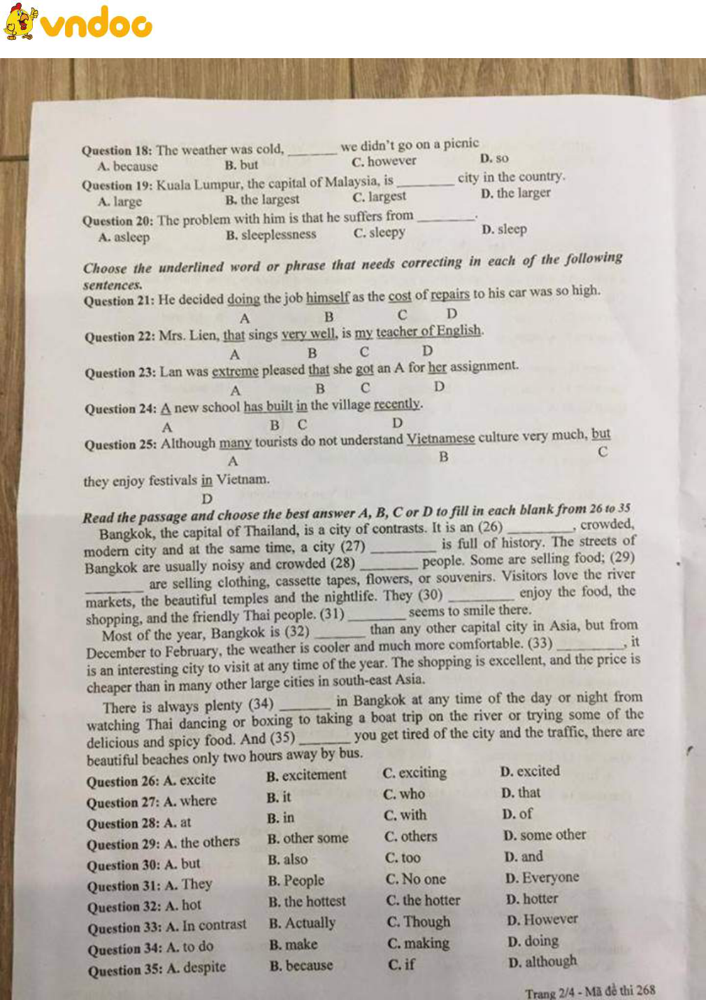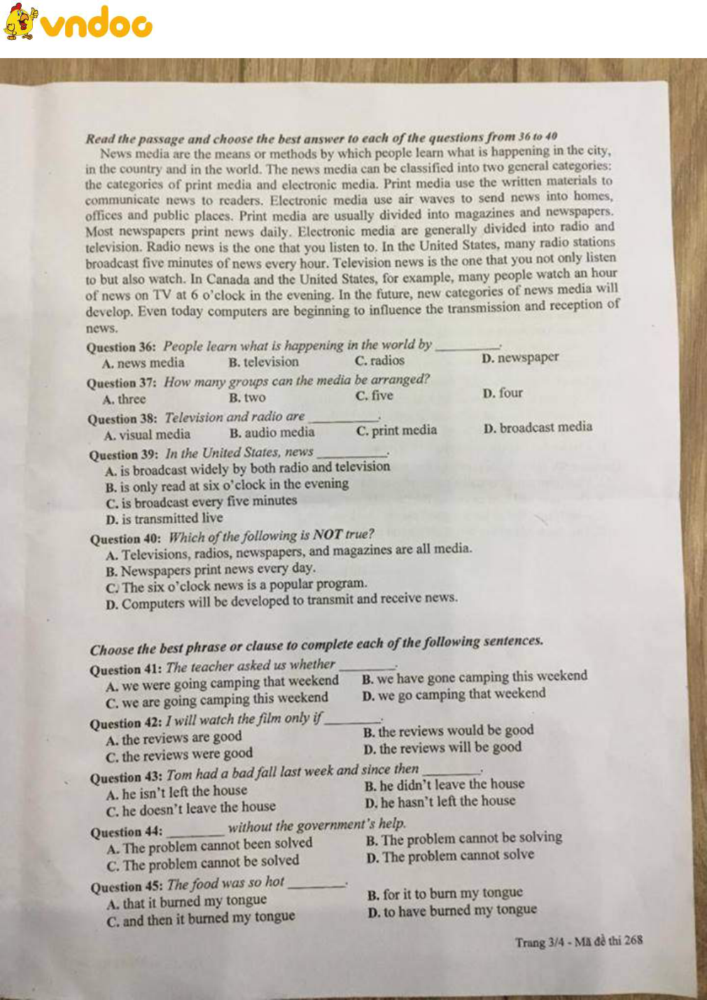 VnDoc.com xin giới thiệu đến các bạn Đề thi vào lớp 10 môn tiếng Anh tỉnh Bắc Ninh năm học 2017-2018 có đáp án được sưu tầm và đăng tải dưới đây sẽ là nguồn tài liệu hữu ích cho các bạn sẽ tham dự kì thi vào lớp 10 tới đây. Chúc các bạn thành công.