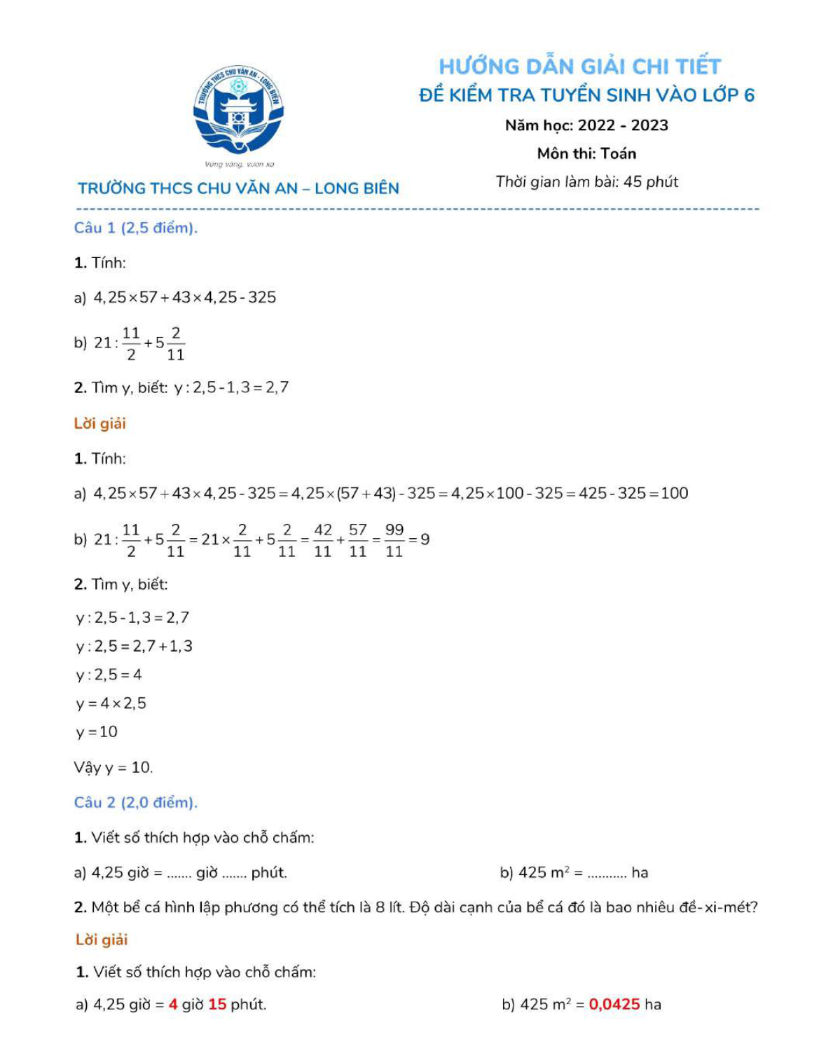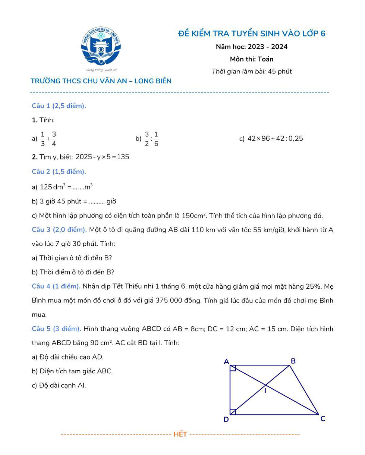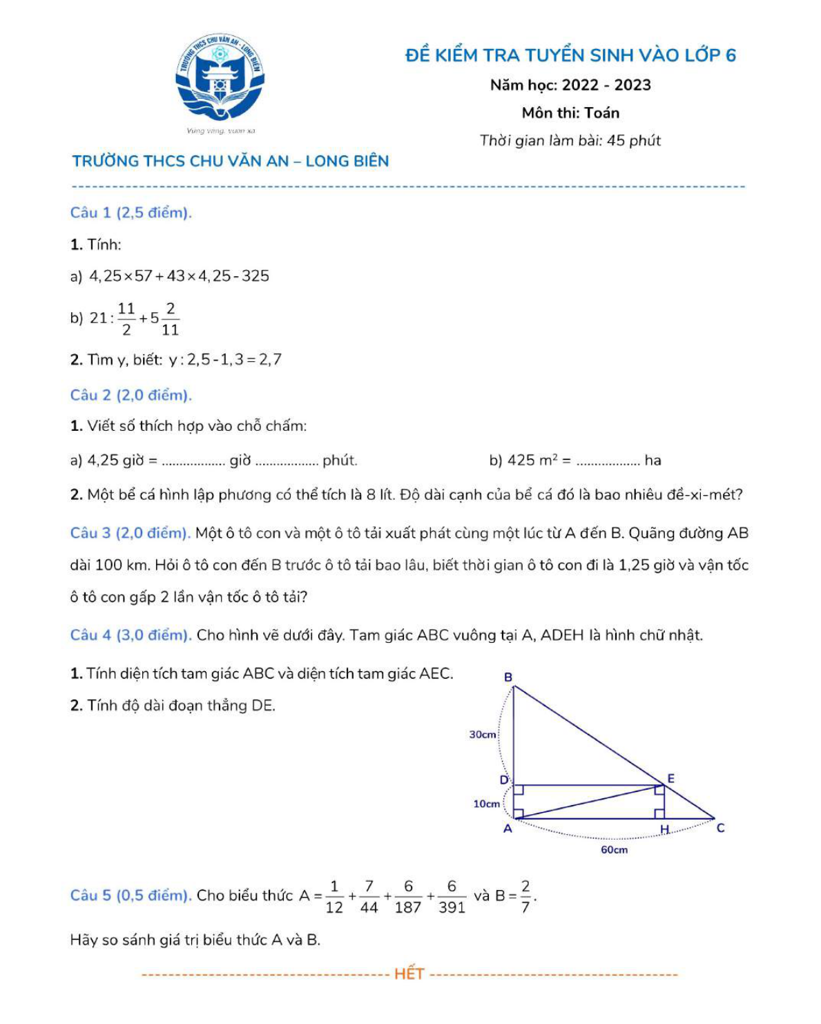 Đề thi vào lớp 6 môn Toán trường THCS Chu Văn An - Long Biên