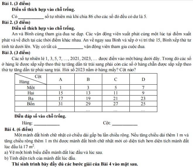 Đề thi vào lớp 6 môn Toán Trần Đại Nghĩa 2023
