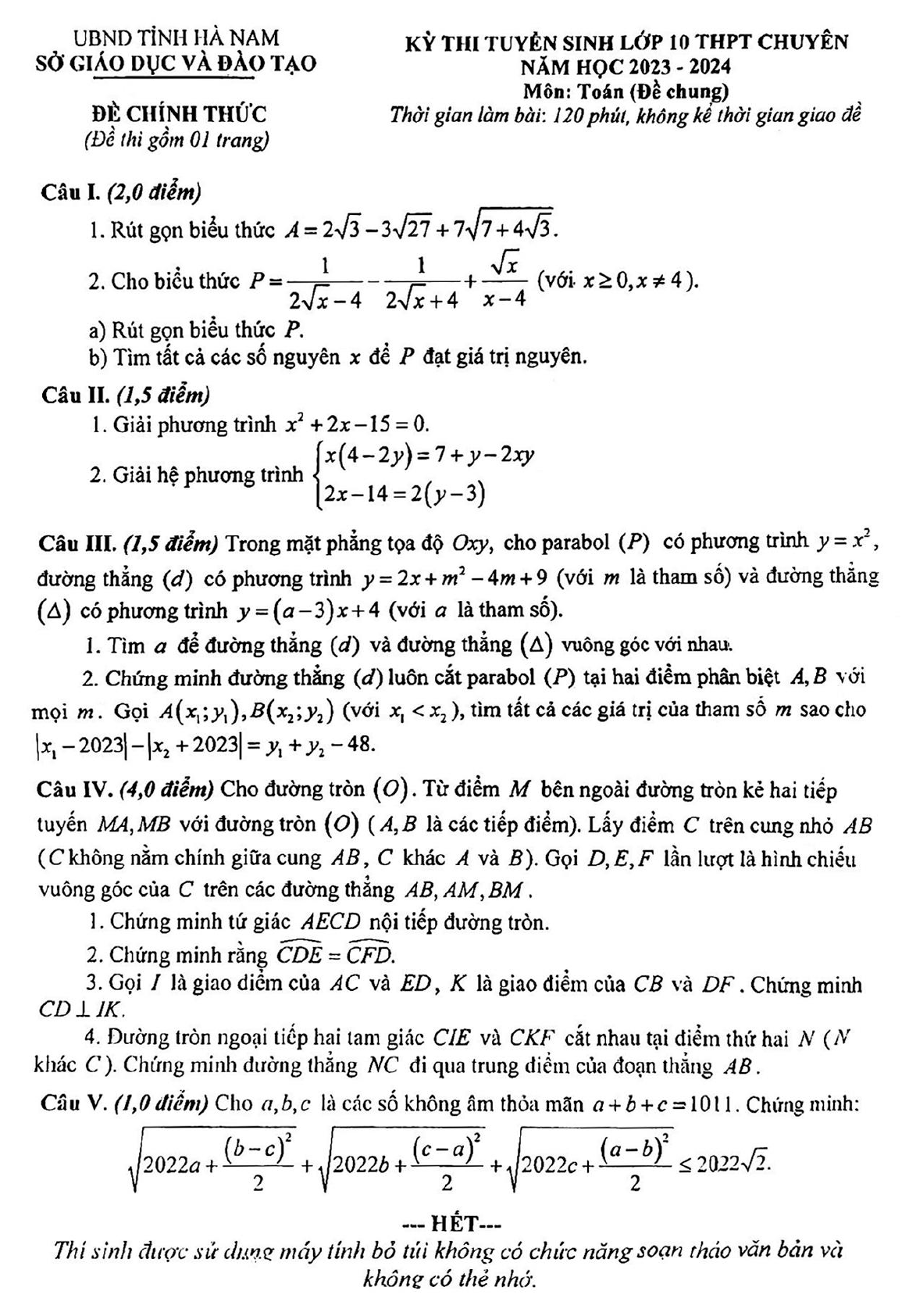 Đề tuyển sinh lớp 10 chuyên môn Toán (chung) sở GD&ĐT Hà Nam năm 2023 - 2024