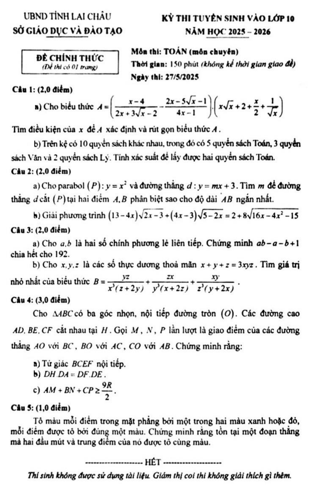 Đề tuyển sinh lớp 10 môn Toán (chuyên) năm 2025 - 2026 sở GD&ĐT Lai Châu