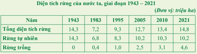 Dựa vào bảng số liệu, em hãy nhận xét sự thay đổi diện tích rừng của nước ta trong giai đoạn 1943 - 2021. Nguyên nhân nào dẫn đến sự thay đổi đó?