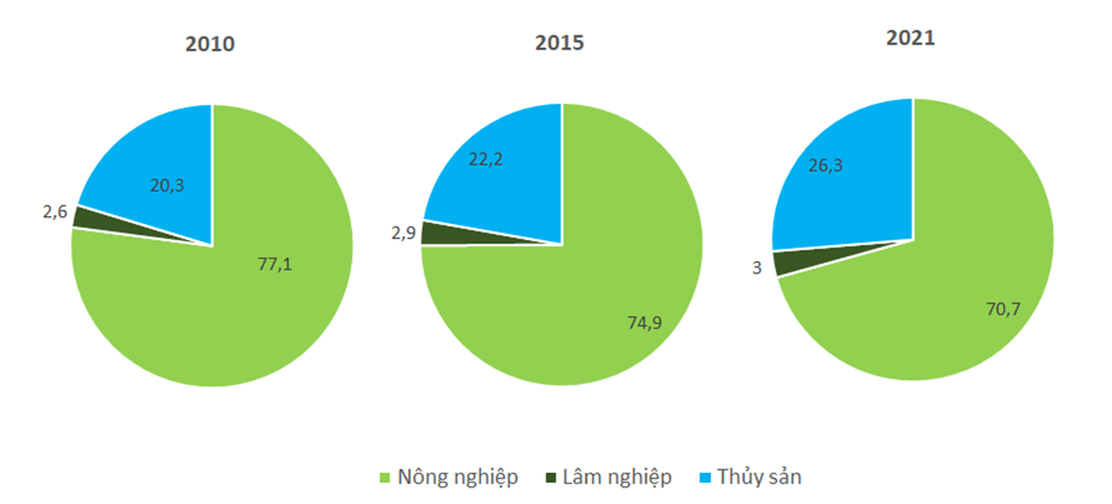 - Ngành thủy sản tăng tỉ trọng khá nhanh và liên tục, từ 20,3% (2010) lên 22,2% (2015) và đạt 26,3% (2021).