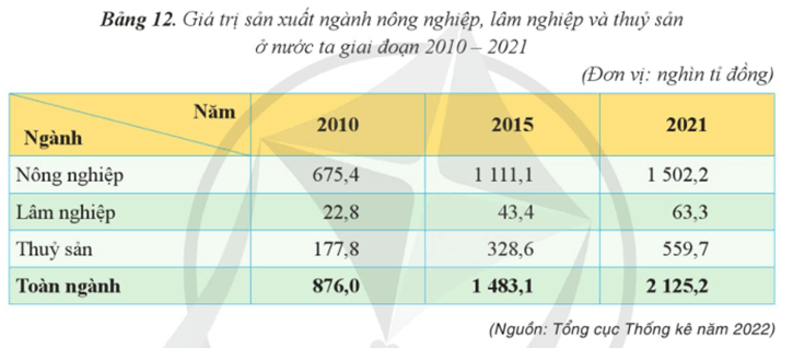 Nhìn chung, cơ cấu giá trị sản xuất ngành nông nghiệp, lâm nghiệp và thủy sản ở nước ta giai đoạn 2010 – 2021 có sự chuyển dịch theo hướng giảm tỉ trọng ngành nông nghiệp, tăng tỉ trọng ngành lâm nghiệp và thủy sản, cụ thể: