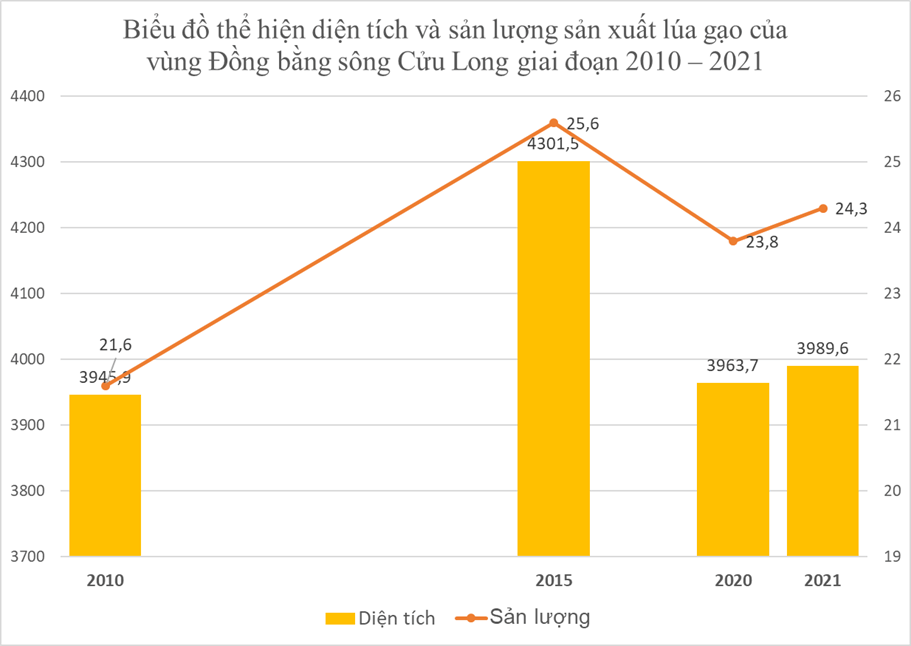+ Về sản lượng: năm 2010 sản lượng đạt 21,6 triệu tấn, đến năm 2015 đã tăng lên 25,6 triệu tấn, năm 2020 mặc dù diện tích giảm nhiều khiến sản lượng giảm nhưng vẫn đạt 23,8 triệu tấn và lại tăng vào năm 2021 đạt 24,3 triệu tấn.