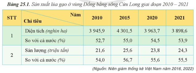 - Nhận xét: Nhìn chung, sản xuất lúa gạo ở Đồng bằng sông Cửu Long giai đoạn 2010 – 2021 đều có sự thay đổi cả về diện tích và sản lượng, cụ thể: