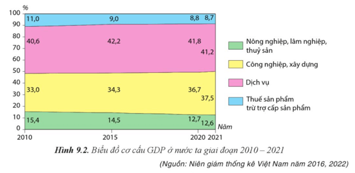 + Tỉ trọng GDP ngành dịch vụ tăng từ 40,6% năm 2010 lên 41,2% năm 2021.