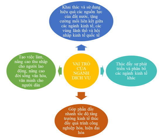 - Vai trò ngành dịch vụ: khai thác và sử dụng hiệu quả các nguồn lực; thúc đẩy sự phát triển và phân bố các ngành kinh tế khác; đẩy nhanh tốc độ tăng trưởng kinh tế thúc đẩy quá trình công nghiệp hóa, hiện đại hóa; tạo việc làm, nâng cao thu nhập, đời sống văn hóa.