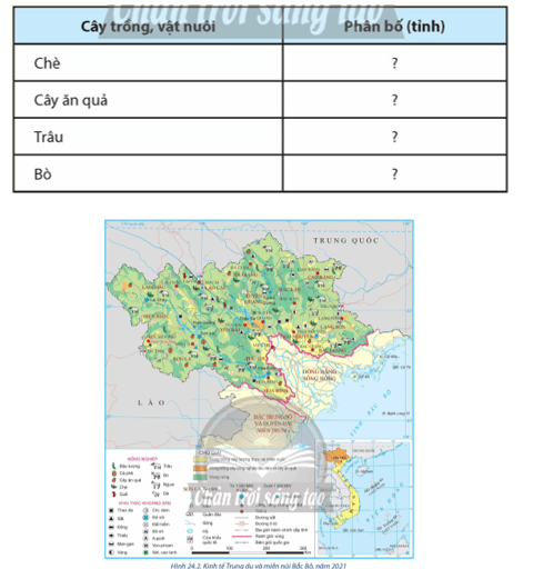 Luyện tập trang 105 Địa Lí 12: Dựa vào hình 24.2, xác định sự phân bố một số cây trồng, vật nuôi ở vùng Trung du và miền núi Bắc Bộ, hoàn thành thông tin theo bảng dưới đây vào vở:
