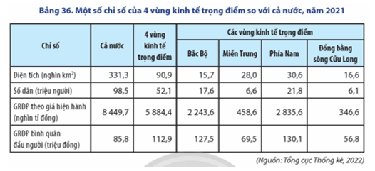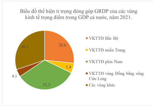 Bảng: Cơ cấu đóng góp GRDP của các vùng kinh tế trọng điểm trong GDP cả nước, năm 2021 (Đơn vị:%).