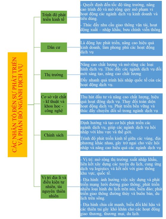 Luyện tập trang 83 Địa Lí 12: Lập sơ đồ thể hiện ảnh hưởng của các nhân tố đến sự phát triển và phân bố ngành dịch vụ của nước ta.