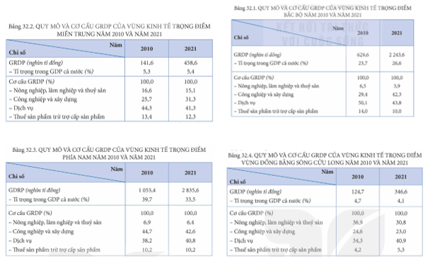 Luyện tập trang 164 Địa Lí 12: Lựa chọn từ các bảng 32.1, 32.2, 32.3, 32.4, vẽ biểu đồ thể hiện cơ cấu GRDP năm 2010 và năm 2021 của một trong bốn vùng kinh tế trọng điểm. Nhận xét và giải thích cơ cấu GRDP của vùng kinh tế trọng điểm đó.