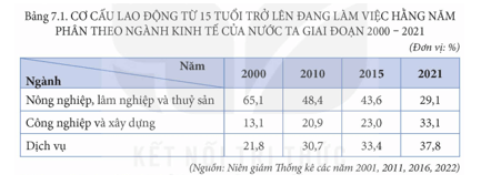 + Tỉ trọng lao động từ 15 tuổi trở lên tăng trong ngành dịch vụ, tăng từ 21,8% năm 2000 lên 37,8% năm 2021, tăng 16%.