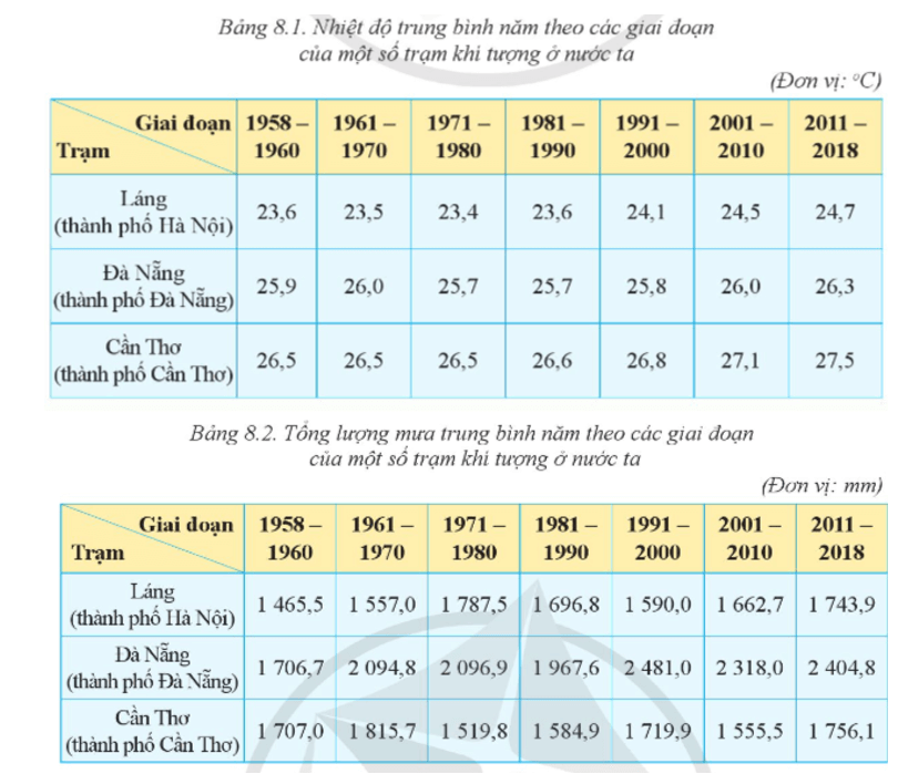 Câu hỏi trang 122 Địa Lí 8: Đọc thông tin và dựa vào các bảng 8.1, 8.2, hãy phân tích tác động của biến đổi khí hậu đối với khí hậu ở nước ta. Lấy ví cụ thể.
