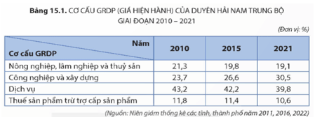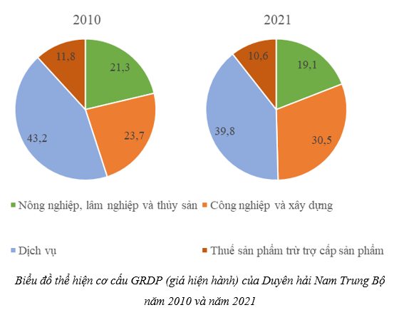 Luyện tập trang 185 Địa Lí 9: Dựa vào bảng 15.1, hãy vẽ biểu đồ thể hiện cơ cấu GRDP (giá hiện hành) của Duyên hải Nam Trung Bộ năm 2010 và năm 2021.
