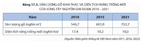 Luyện tập trang 194 Địa Lí 9: Dựa vào bảng 17.3, hãy nhận xét sản lượng gỗ khai thác và diện tích rừng trồng mới ở Tây Nguyên giai đoạn 2010 - 2021.