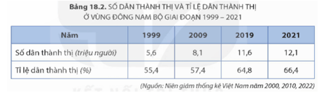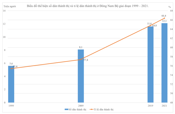 - Nhận xét: Nhìn chung số dân thành thị và tỉ lệ dân thành thị ở Đông Nam Bộ giai đoạn 1999 - 2021 đều có sự tăng lên, cụ thể: