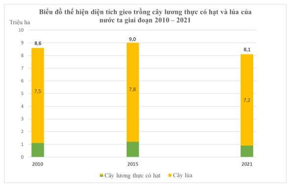 + Giai đoạn 2015 - 2021, cả diện tích tích gieo trồng cây lương thực có hạt và lúa đều giảm, diện tích cây lương thực có hạt giảm xuống chỉ còn 8,1 triệu ha, trong đó diện tích cây lúa giảm còn 7,2 triệu ha (2021).