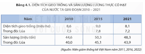 - Nhận xét: Nhìn chung diện tích gieo trồng cây lương thực có hạt và lúa của nước ta giai đoạn 2010 - 2021 có sự biến động, xu hướng giảm song lúa vẫn là cây chủ đạo, cụ thể:
