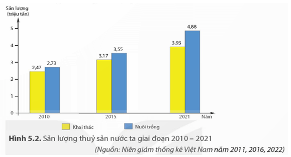 - Nhận xét: nhìn chung cơ cấu sản lượng thủy sản của nước ta giai đoạn 2010 - 2021 đã có sự thay đổi theo hướng giảm tỉ trọng sản lượng thủy sản khai thác, tăng tỉ trọng sản lượng thủy sản nuôi trồng, cụ thể: