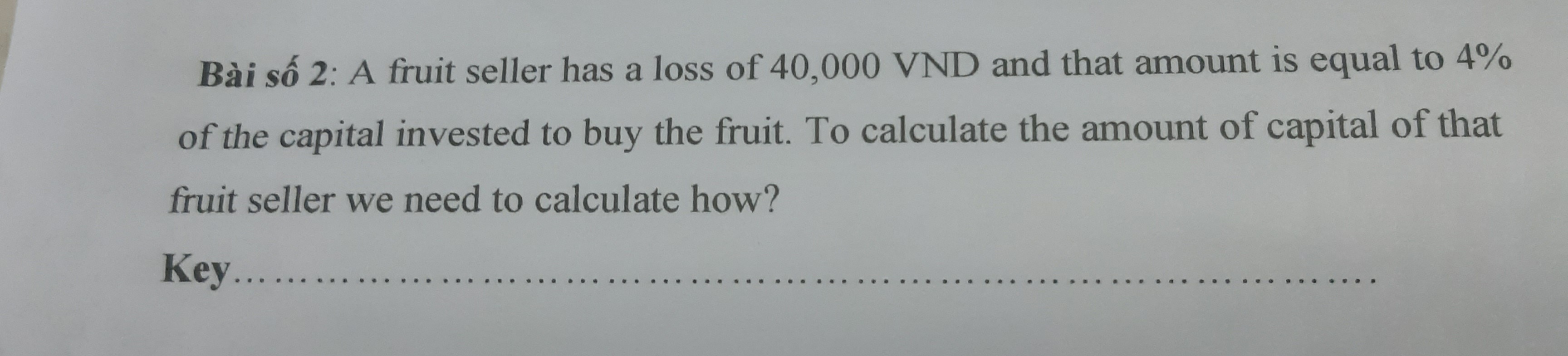 Dịch bài toán: A fruit seller has a loss of 40.000 VNĐ and that amount is equal to 4%