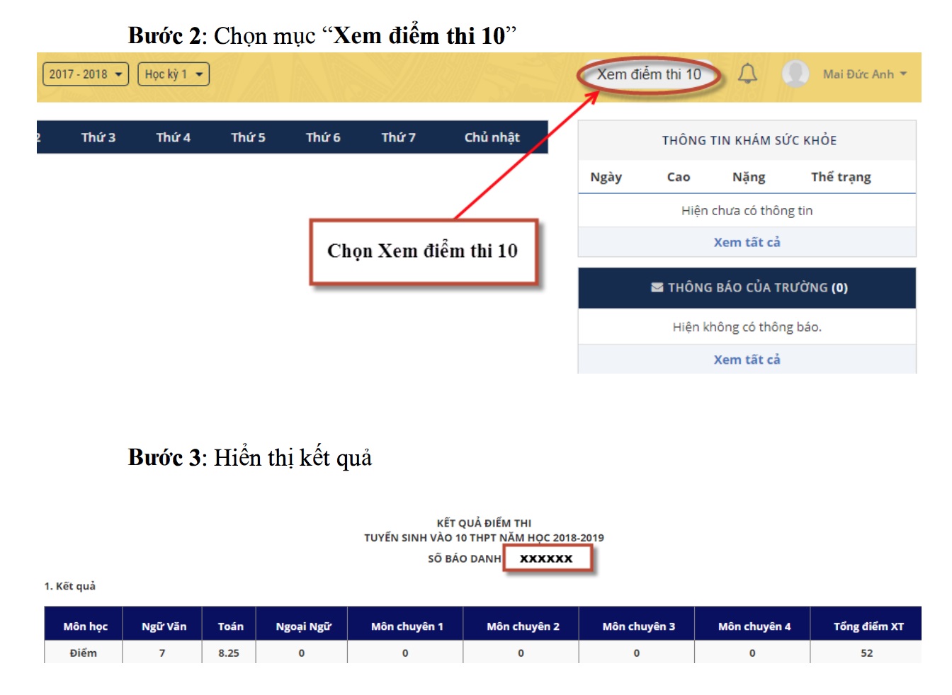 Hiện tại, học sinh có thể sử dụng mã học sinh hoặc số báo danh đăng nhập để xem điểm qua phần mềm sổ liên lạc.