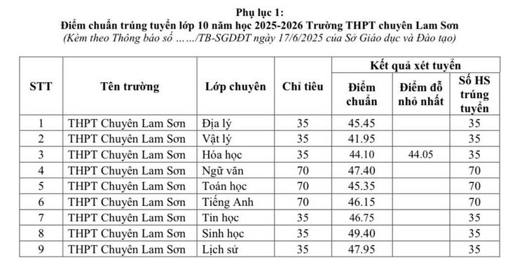 Điểm chuẩn vào lớp 10 THPT Chuyên Lam Sơn năm 2025: