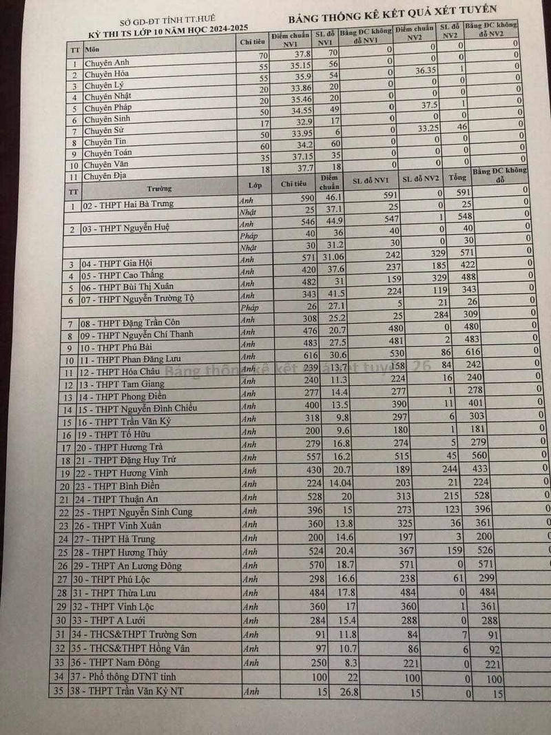 Trong khi đó, Trường THPT Gia Hội, điểm chuẩn nguyện vọng 1 là 32,40 và NV2 là 43,24. Điểm chuẩn NV1 Trường THPT Nguyễn Trường Tộ là 47,00; NV2 là 48, 40. Trường THPT Bùi Thị Xuân điểm chuẩn NV1 là 29,80, NV2 là 45,70; Trường THPT Đặng Trần Côn lần lượt của hai nguyện vọng là 22,20 và 27,80; Trường THPT Cao Thắng lần lượt là 42,10 và 51,80; Trường THPT Phan Đăng Lưu điểm chuẩn NV1 là 33,00 và NV2 là 46,10; THPT Hương Vinh có điểm chuẩn lần lượt 22,00 và 23,50; Trường THPT Thuận Hóa 22,60 và 24,10. Đối với Trường phổ thông Dân tộc nội trú tỉnh, điểm chuẩn NV1 là 30,50.