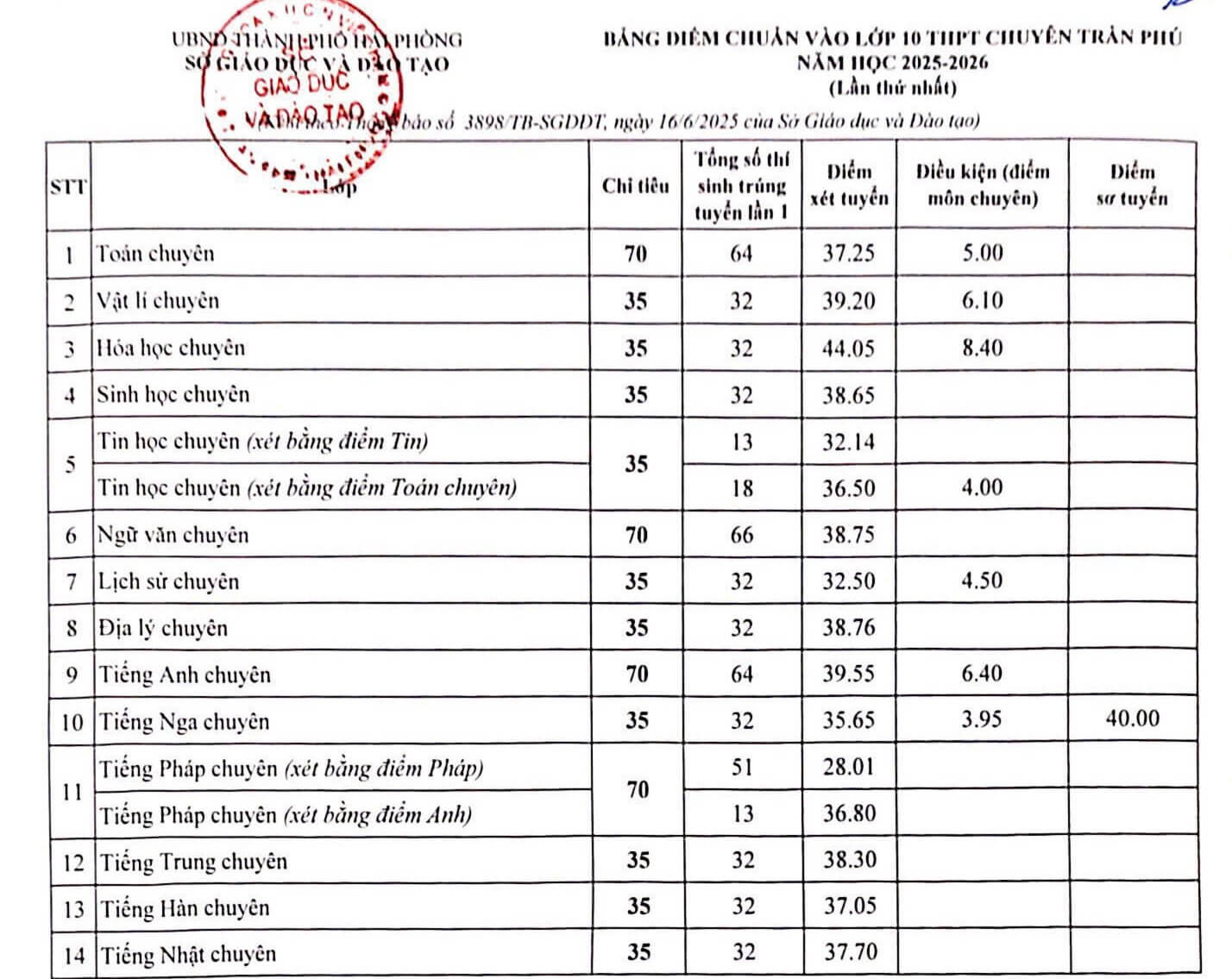 Dưới đây là điểm chuẩn vào lớp 10 Trường THPT Chuyên Trần Phú năm 2025: