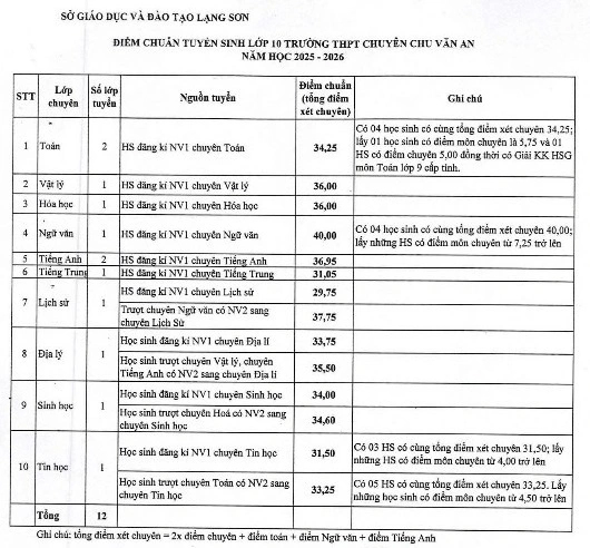 Hiện tại, Sở Giáo dục và Đào tạo tỉnh Lạng Sơn mới công bố điểm chuẩn xét tuyển vào lớp 10 Trường THPT Chuyên Chu Văn An. Mức điểm trúng tuyển vào các lớp chuyên dao động trong khoảng từ 29,75 đến 40 điểm. Trong đó, lớp chuyên ngữ văn có điểm chuẩn cao nhất, ở mức 40 điểm.