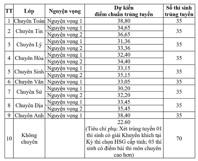 | Chuyên Hóa | NV1 | 37,15; ưu tiên xét thí sinh có điểm bài thi môn chuyên cao hơn (6,9) |